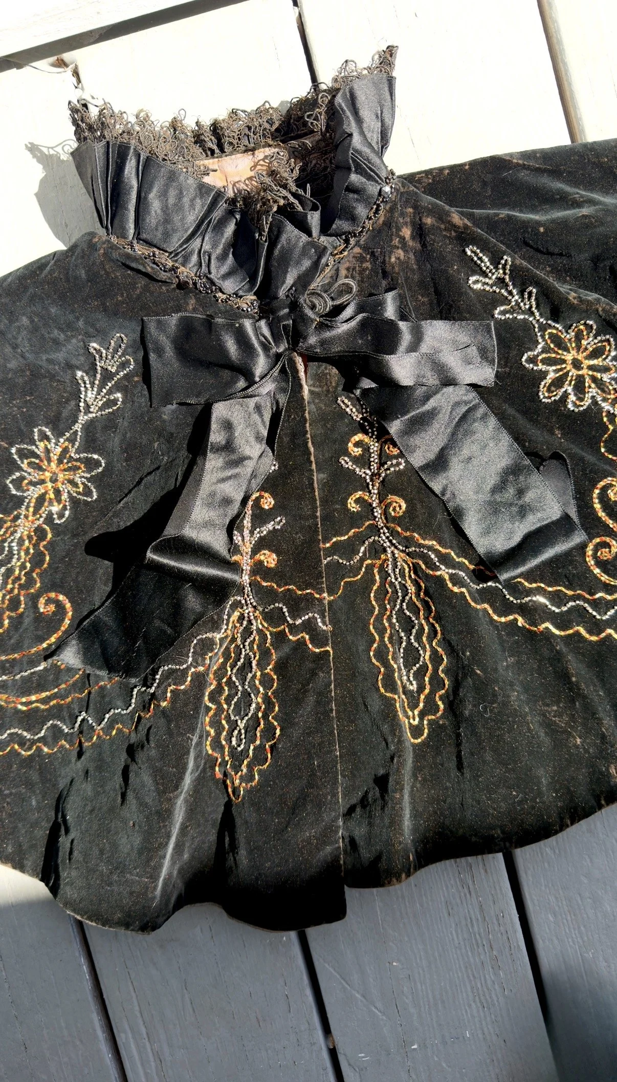 Beautiful Victorian cape in a black cotton velvet with two tone golden silk floss embroidery. Bright silver cut steel beading throughout the pattern.