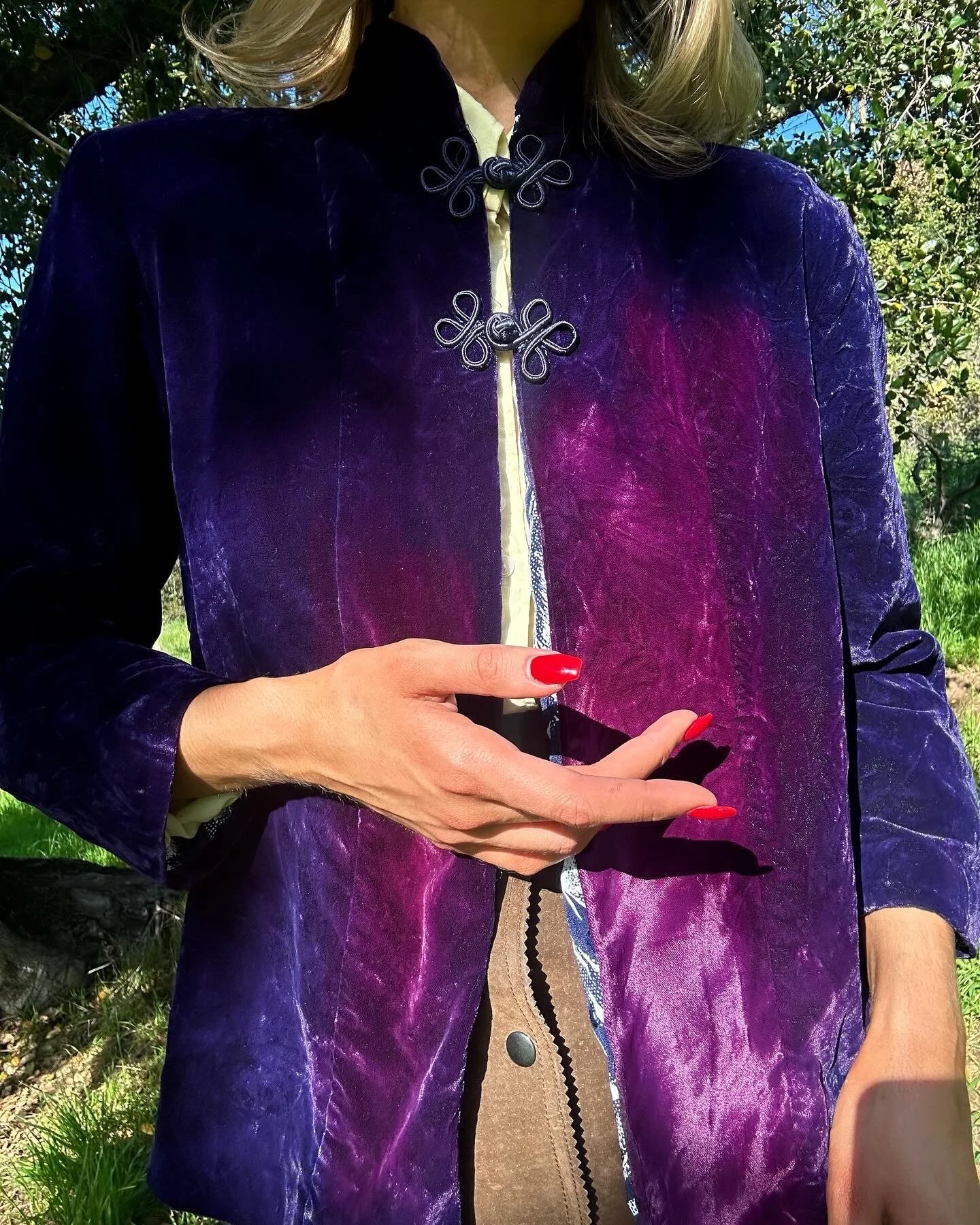 For full moon rituals and conjurings… vtg 60’s deep purple long sleeved velvet jacket with two frog closures at the top of the neck. Lined with blue and white floral pattern, most likely handmade. Some areas of the velvet creating a tie-dye effect that makes the jacket look even more mystical!