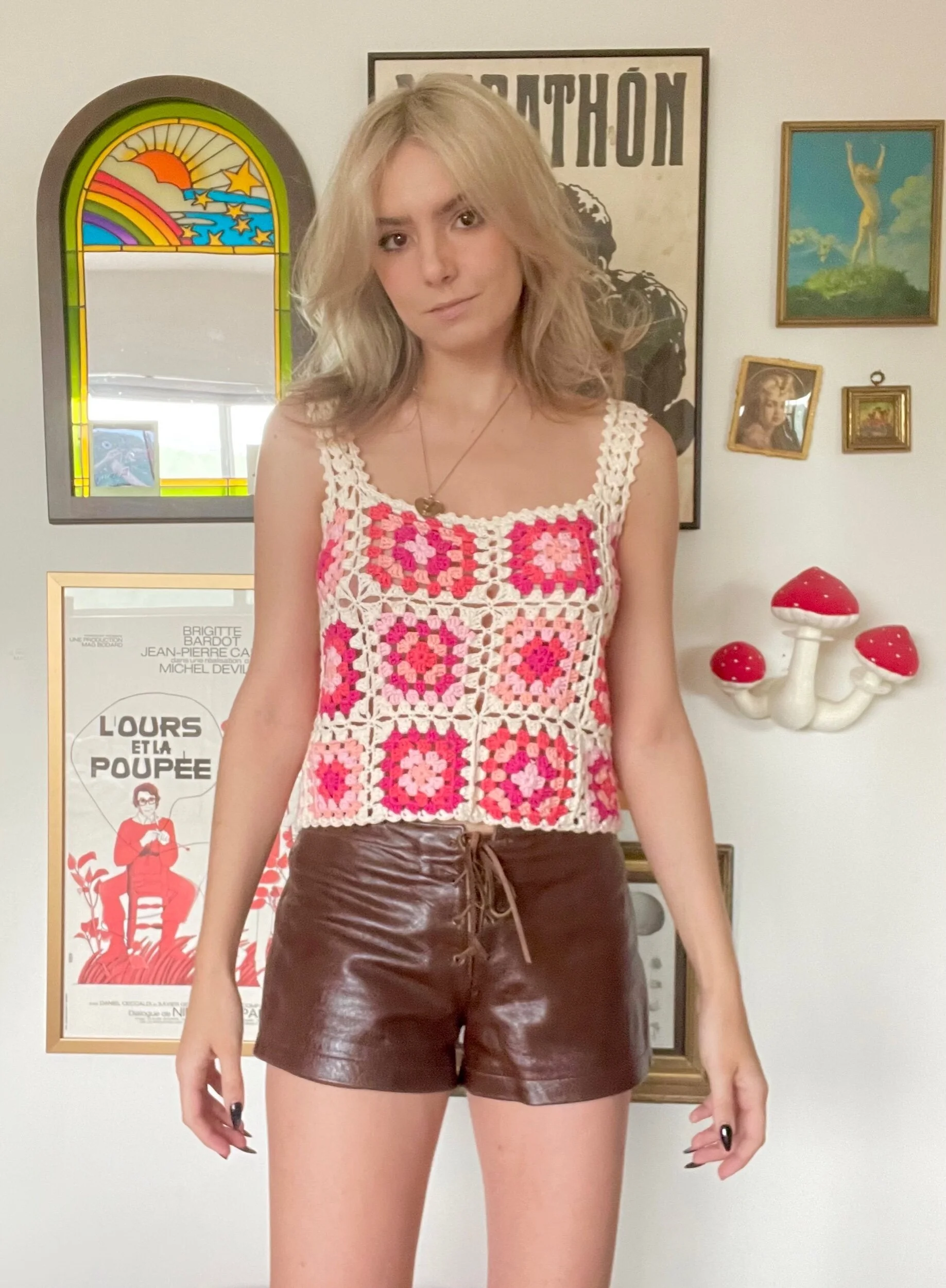 vtg 70’s handmade crochet tank top in beautiful pink granny square hues! Wearable vintage crochet pieces are hard to find, especially in tank top form. Excellent condition