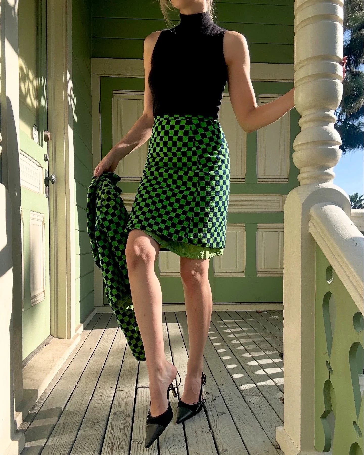 vtg 1960’s three-piece wool checkered set with a pencil skirt, jacket and scarf. I lovee any vintage checkered items I find! The jacket is perfectly cropped and buttons up, and the pencil skirt is so flattering, zips on the side and fastens with a button.