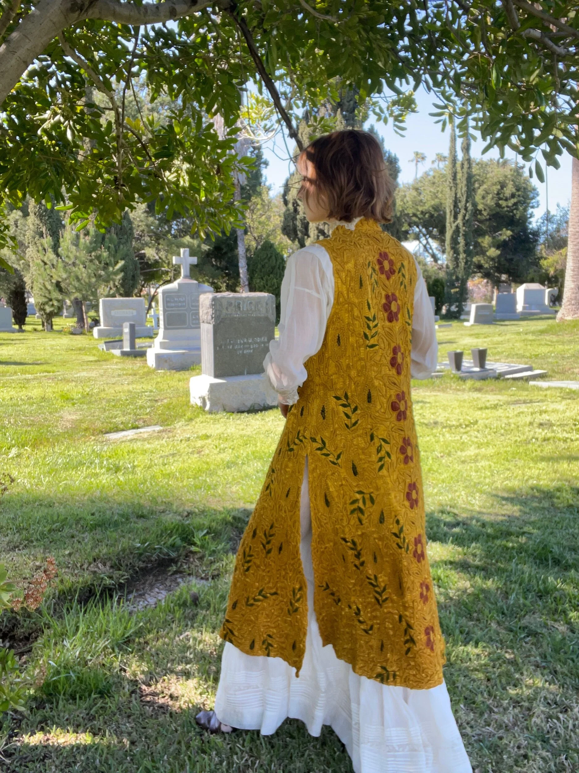 Vtg 60’s shimmery gold vest for a high priestess. I feel very lucky to have this in my current posession. Indian cotton, soft red flowers pop in the liquid gold. By Chandra UK
