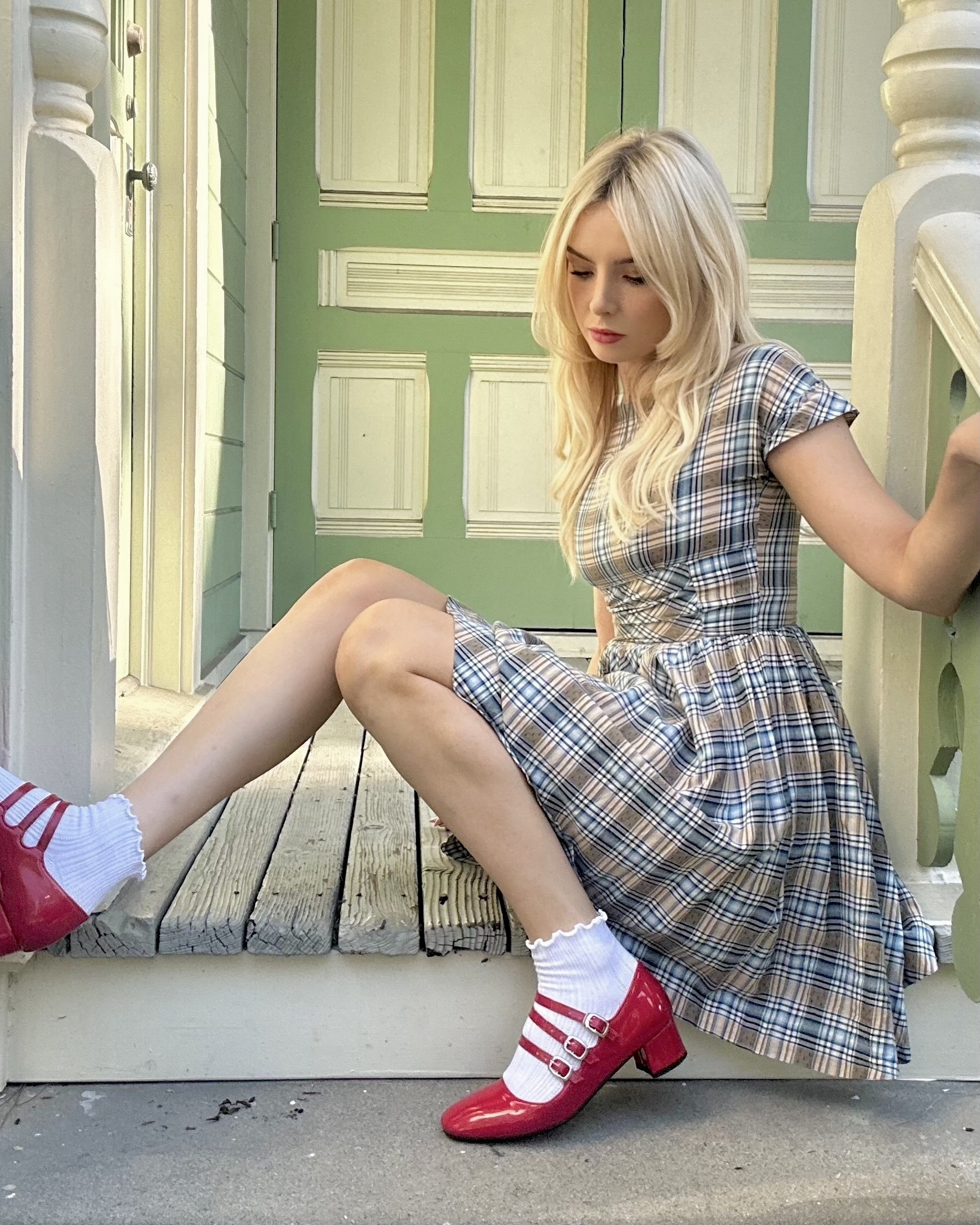 vtg 50’s adorable tartan plaid mini dress with a cross style design on the waist and modest high neckline, Zips on the side. Looks so darling with white frilly socks and mary janes!