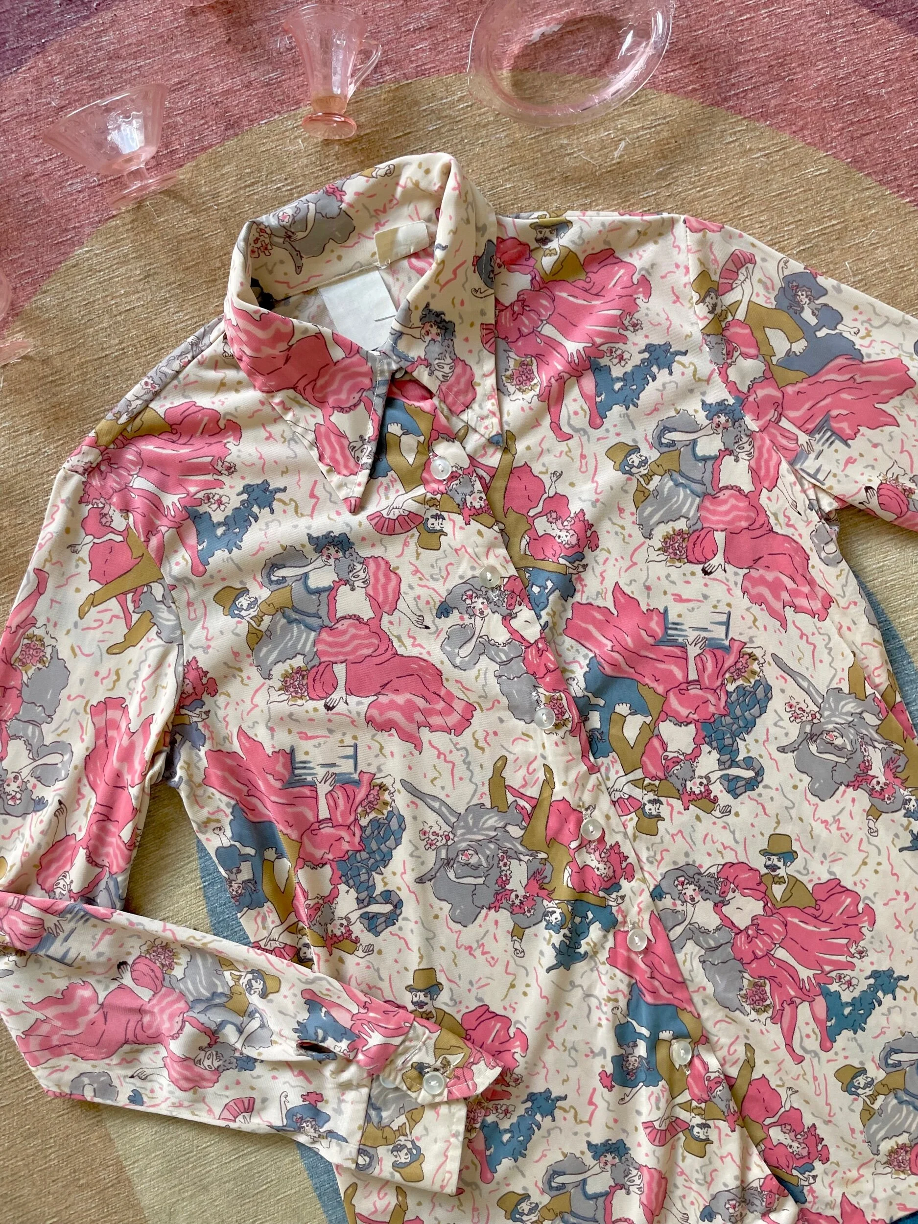 Magickal vtg 70’s novelty blouse with tipsy dancing masqueraders! Lords and ladies living it up in a surrealist fever dream party world, watta life! Must be nice! They remind me a bit of the Lucy in the Sky with Diamonds can can dancers