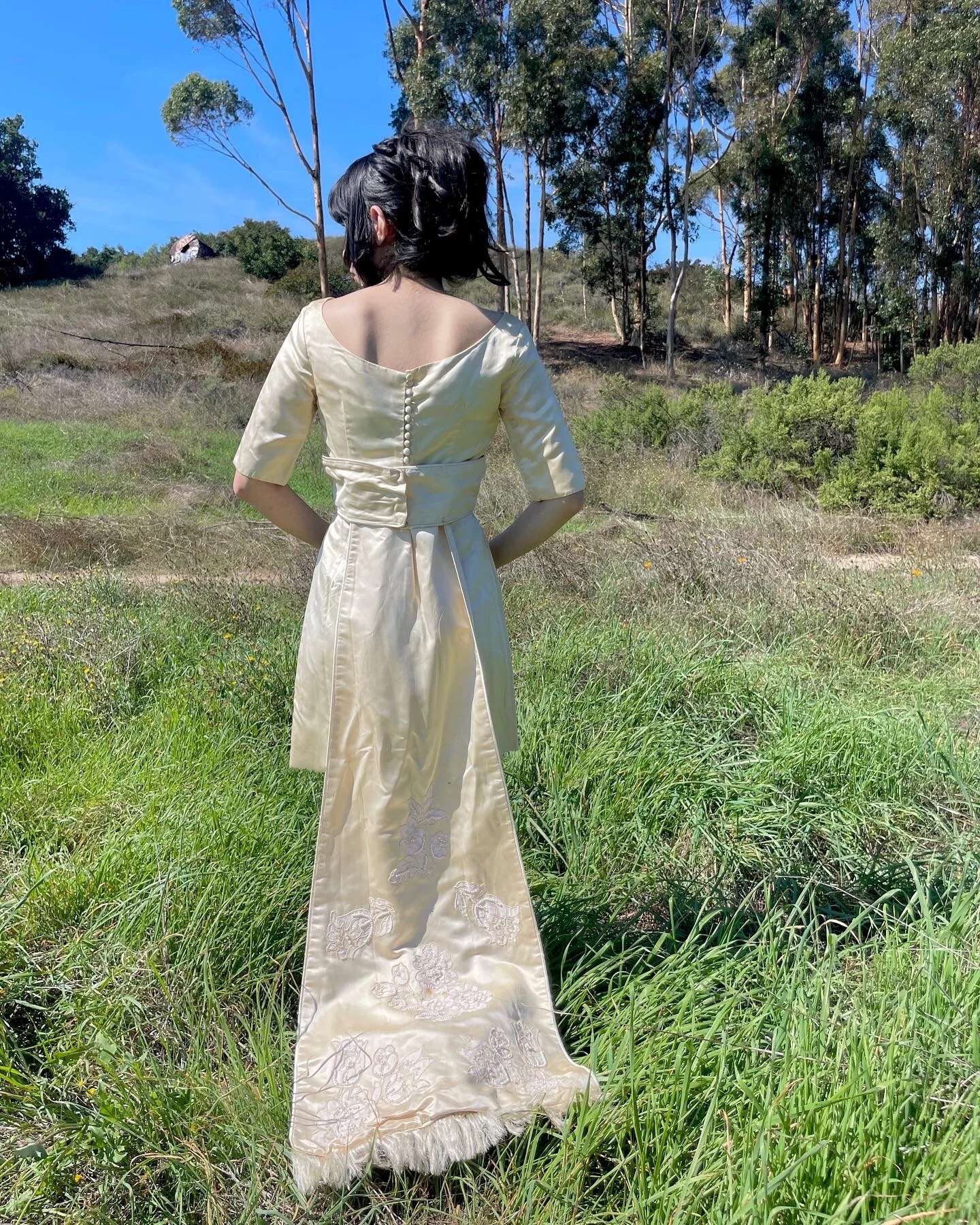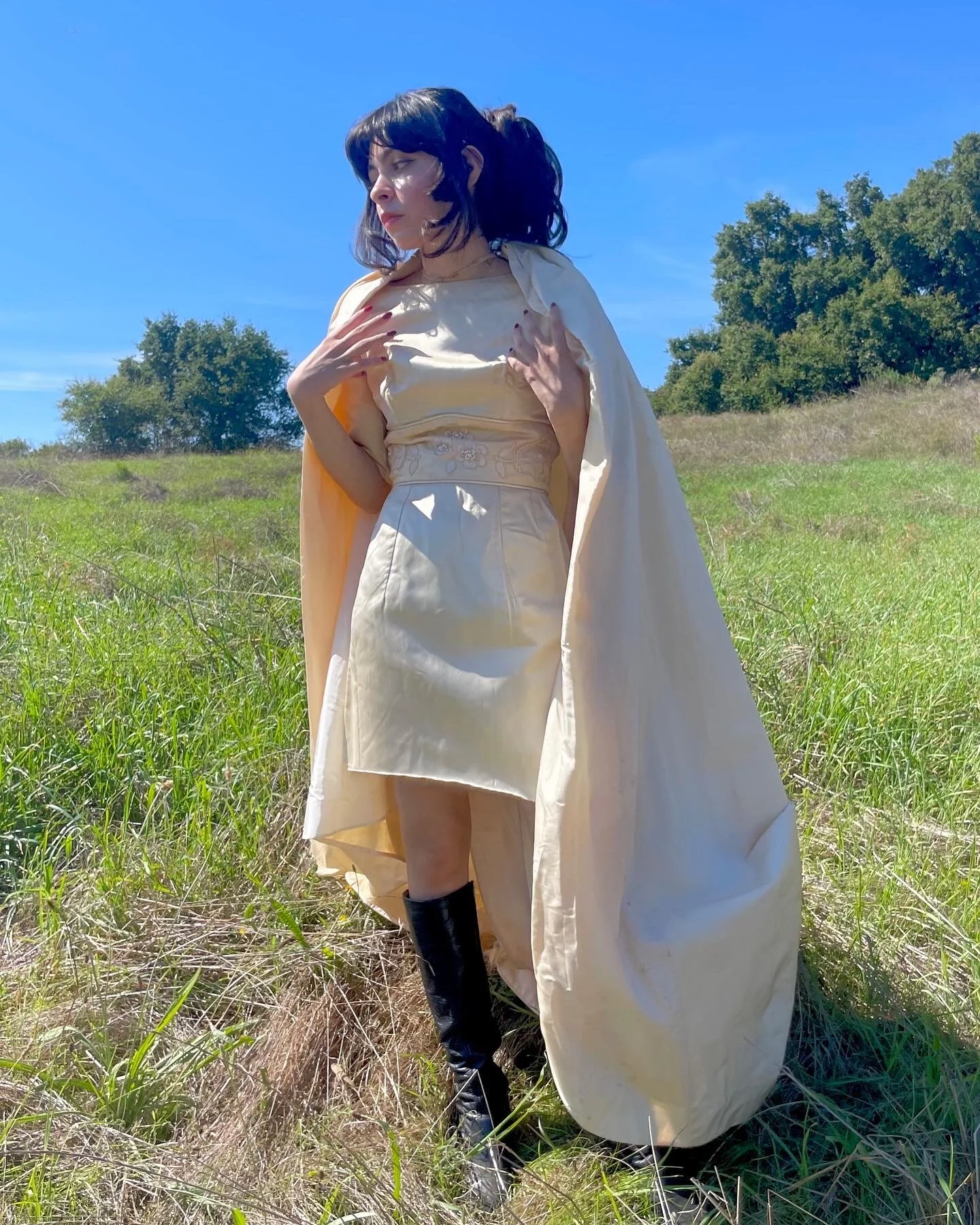 vtg 20’s costume piece, cream silk dress set with a tassled train and HUGE cape! Cape doubles as a comforter for a twin size bed! (Jk but also not jk)