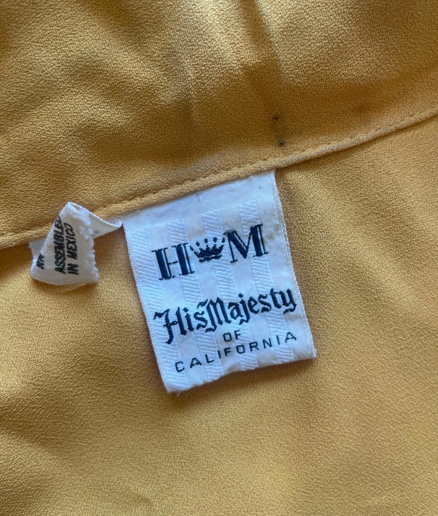 Regal 1960s unisex mustard color blouse with the most amazing exaggerated dagger collar and balloon sleeves with 32 inch circumference! By ‘His Majesty of California’, would’ve been perfect for Renaissance fair season but honestly, I would wear something like this all year round!