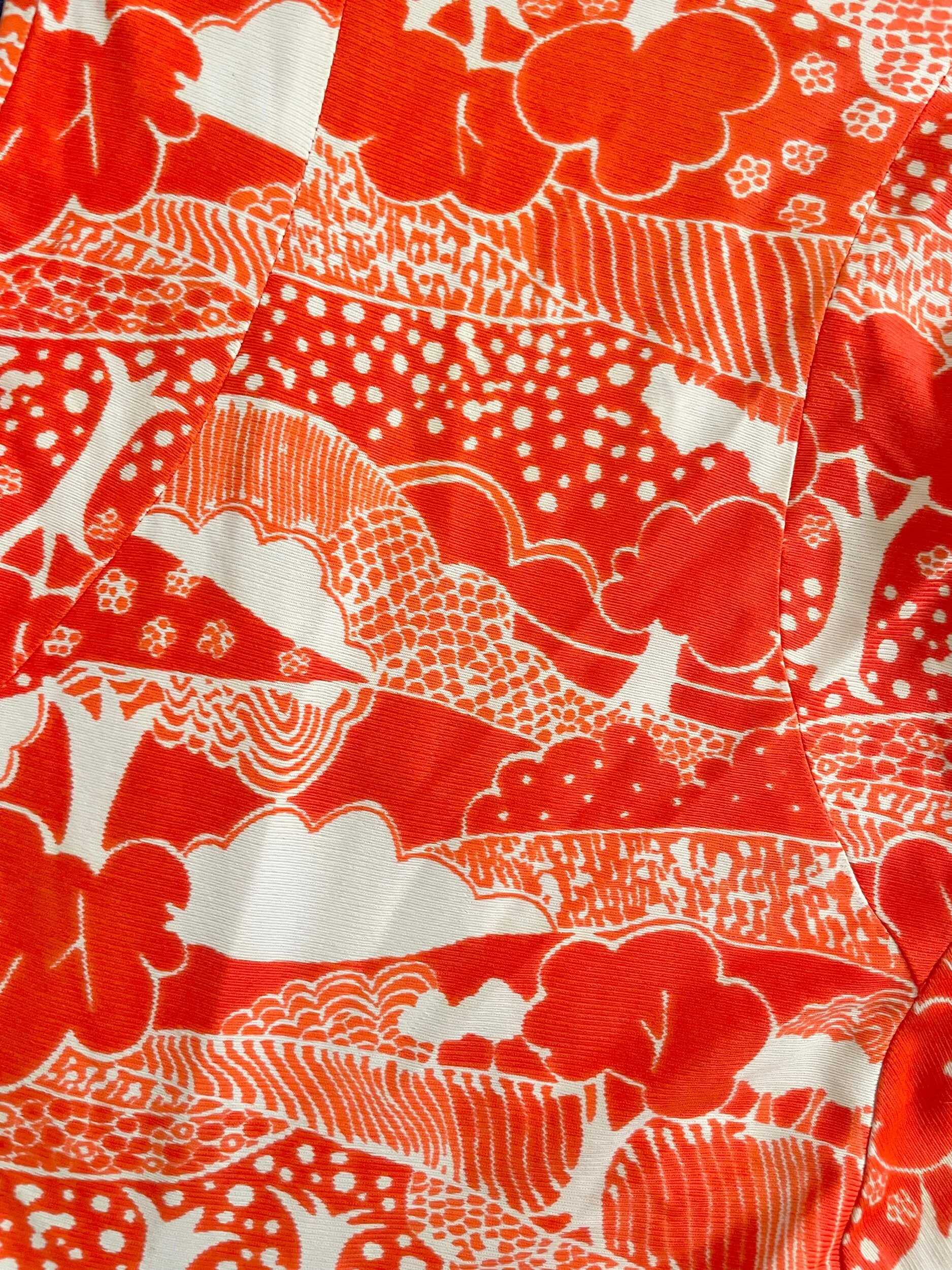 vtg 70’s orange psychedelic forest print with rolling hills in a daisy paradise! Great for when you still wanna wear something bright and cheerful even in all this horrible June Gloom. Beautiful dagger collar and subtle scoop neckline, skirt flares out for a super flattering fit!