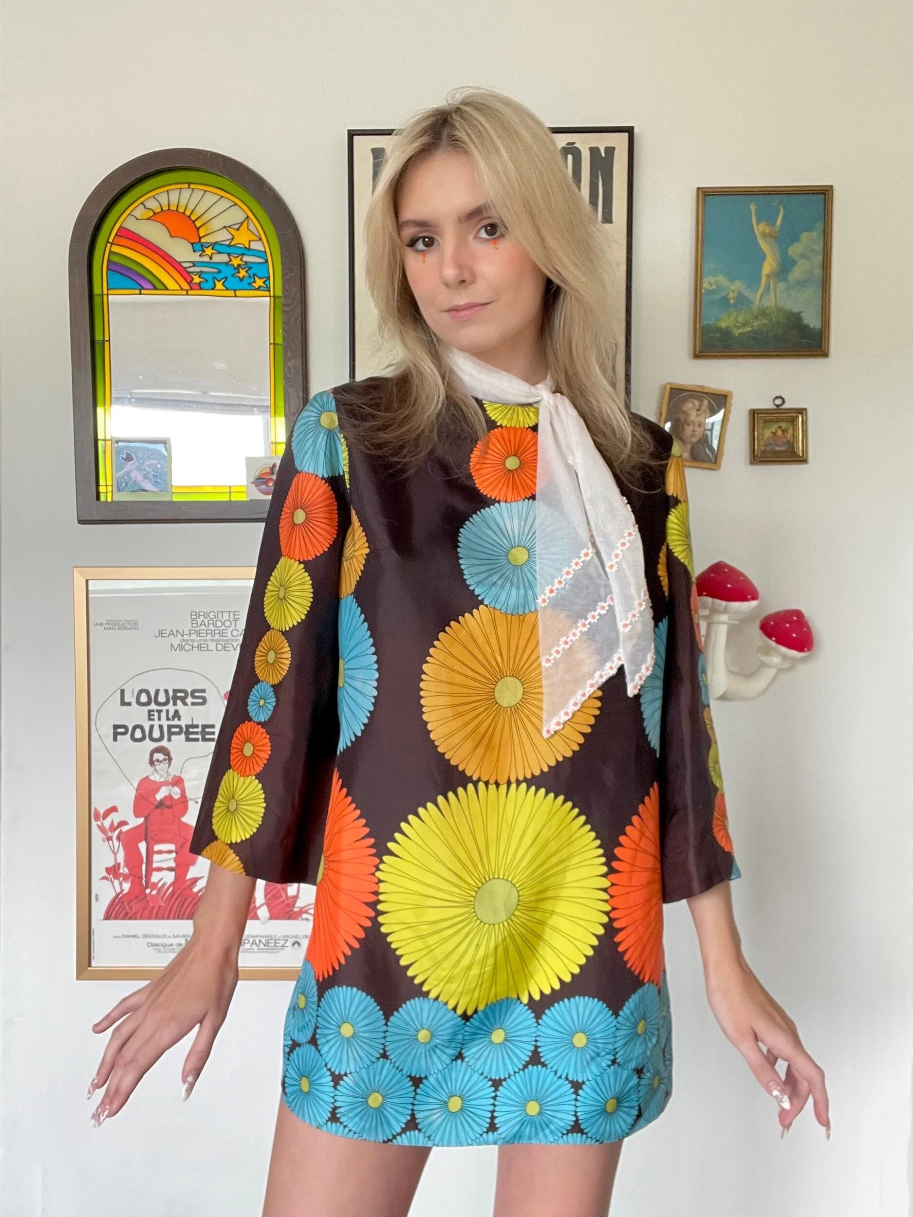 Awesome vtg 60’s mod daisy print mini dress with bell sleeves! Orange, blue and yellow daisies cascading down this insane mini dress.