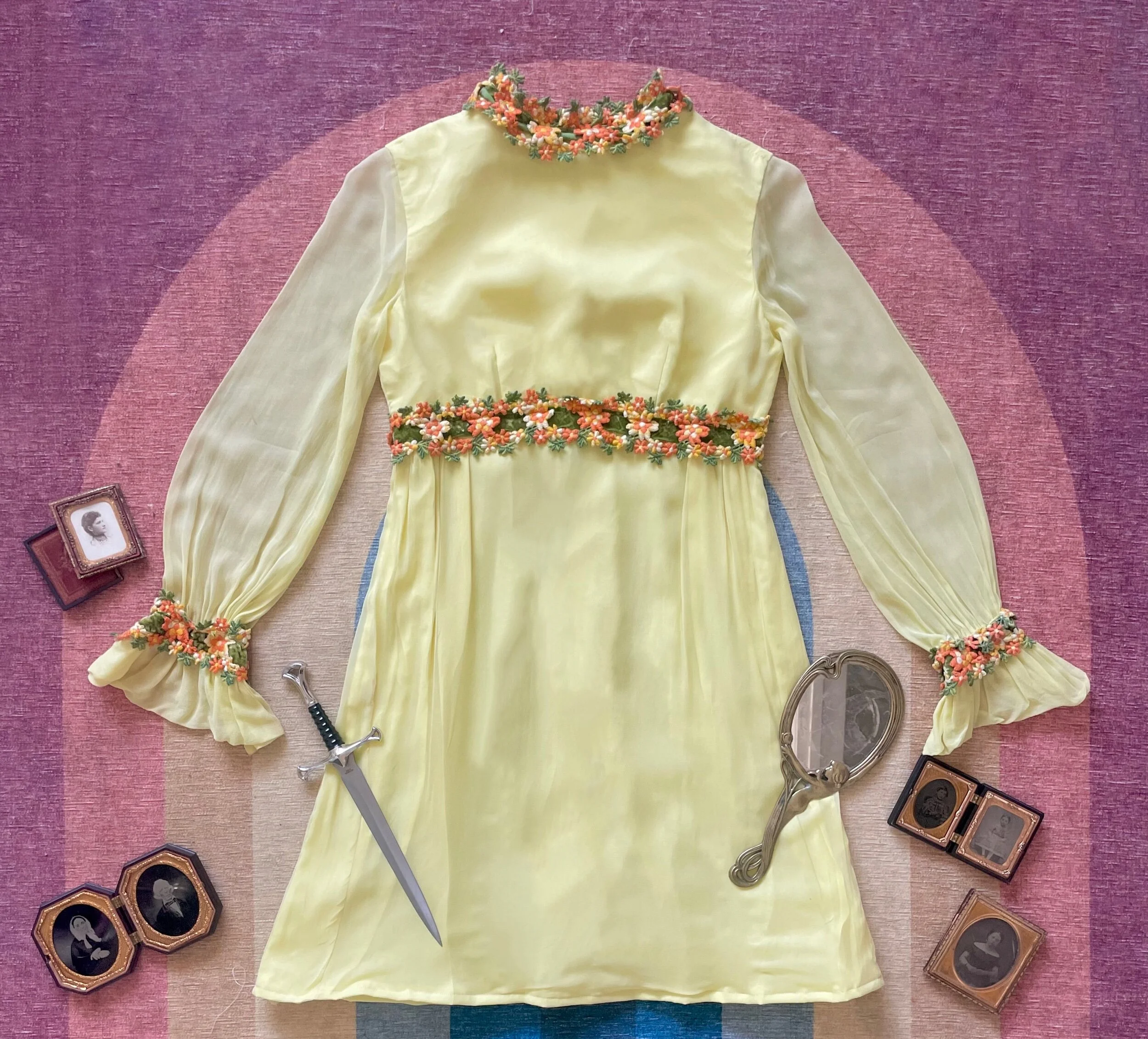 vtg 60’s bright and beautiful yellow mini dress with flowing chiffon. A ray of literal sunshine! Flowers and velvet ribbon decorations throughout, balloon sleeves in light chiffon too. I absolutely love mini dresses like this, they remind me so much of that timeless youthful 60’s flower power girl look