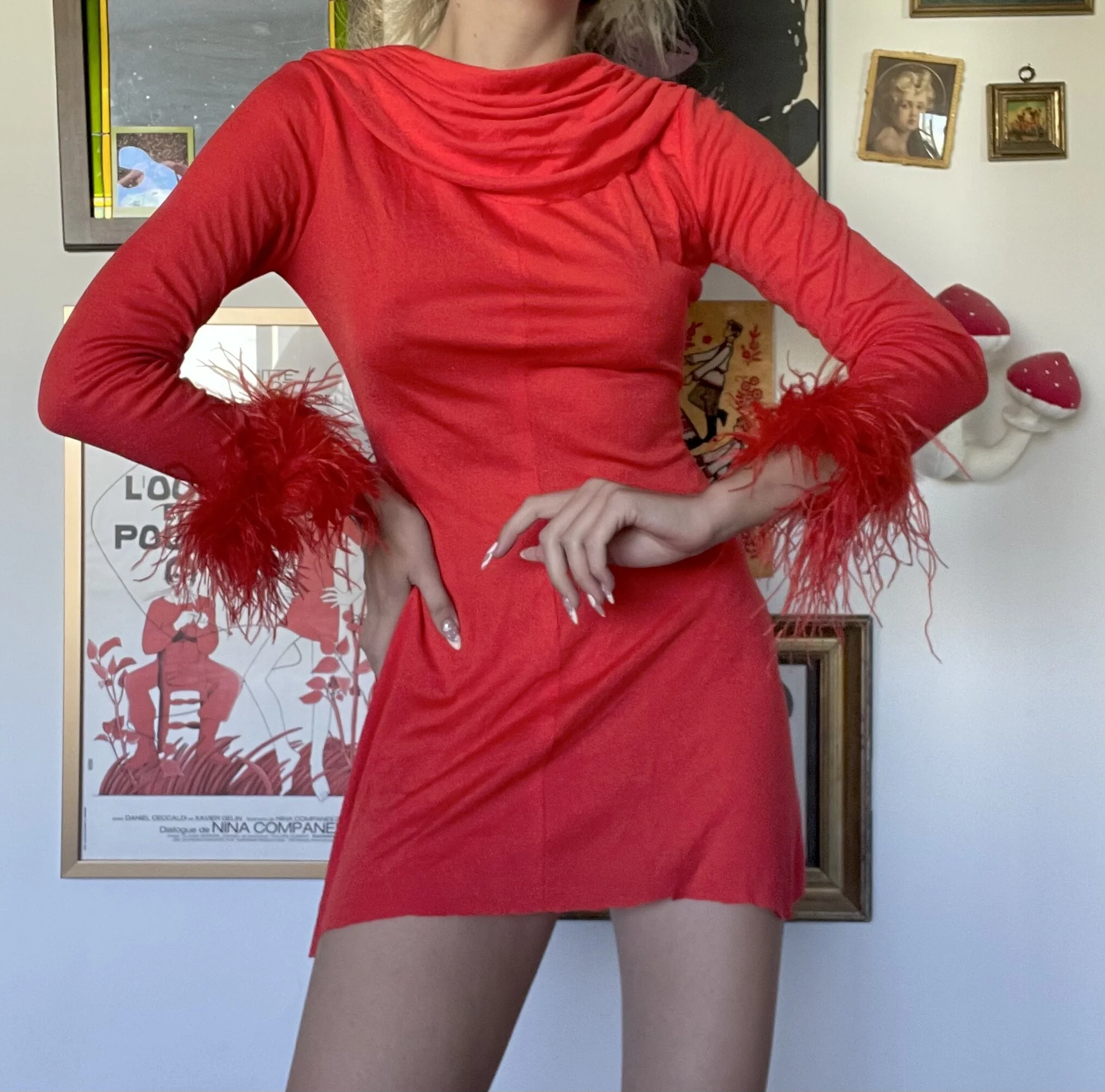 Vtg 70’s feather cuff mini dress, for women who are the center of attention and wouldn’t have it any other way. Truly a scorpio queen dress! Crimson red with feathers adorning the cuffs, and a cutout back, high drape neckline.