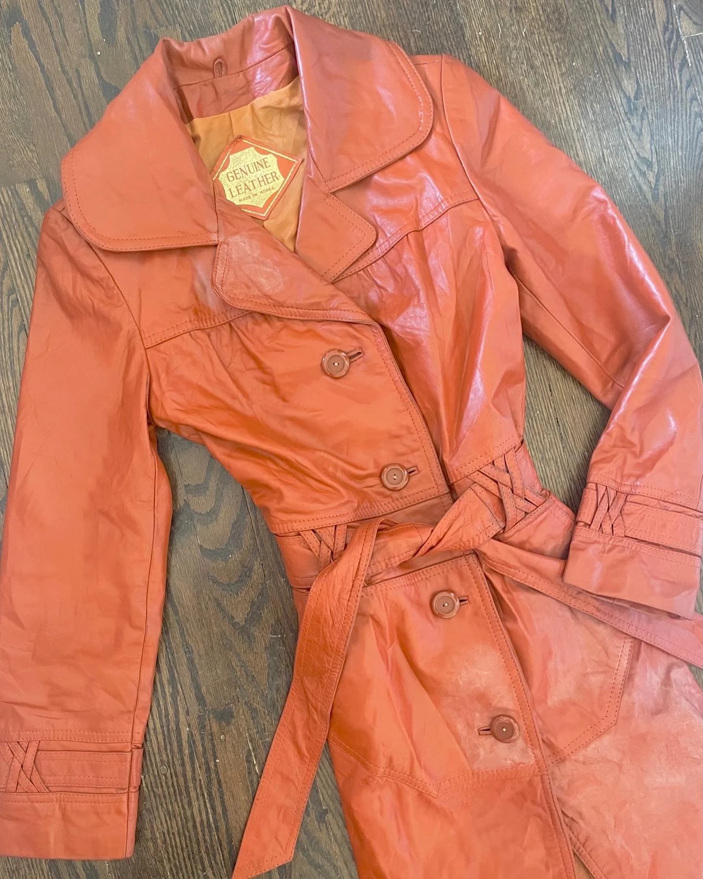 Vtg 70’s rust red trenchcoat, genuine buttery soft leather with a