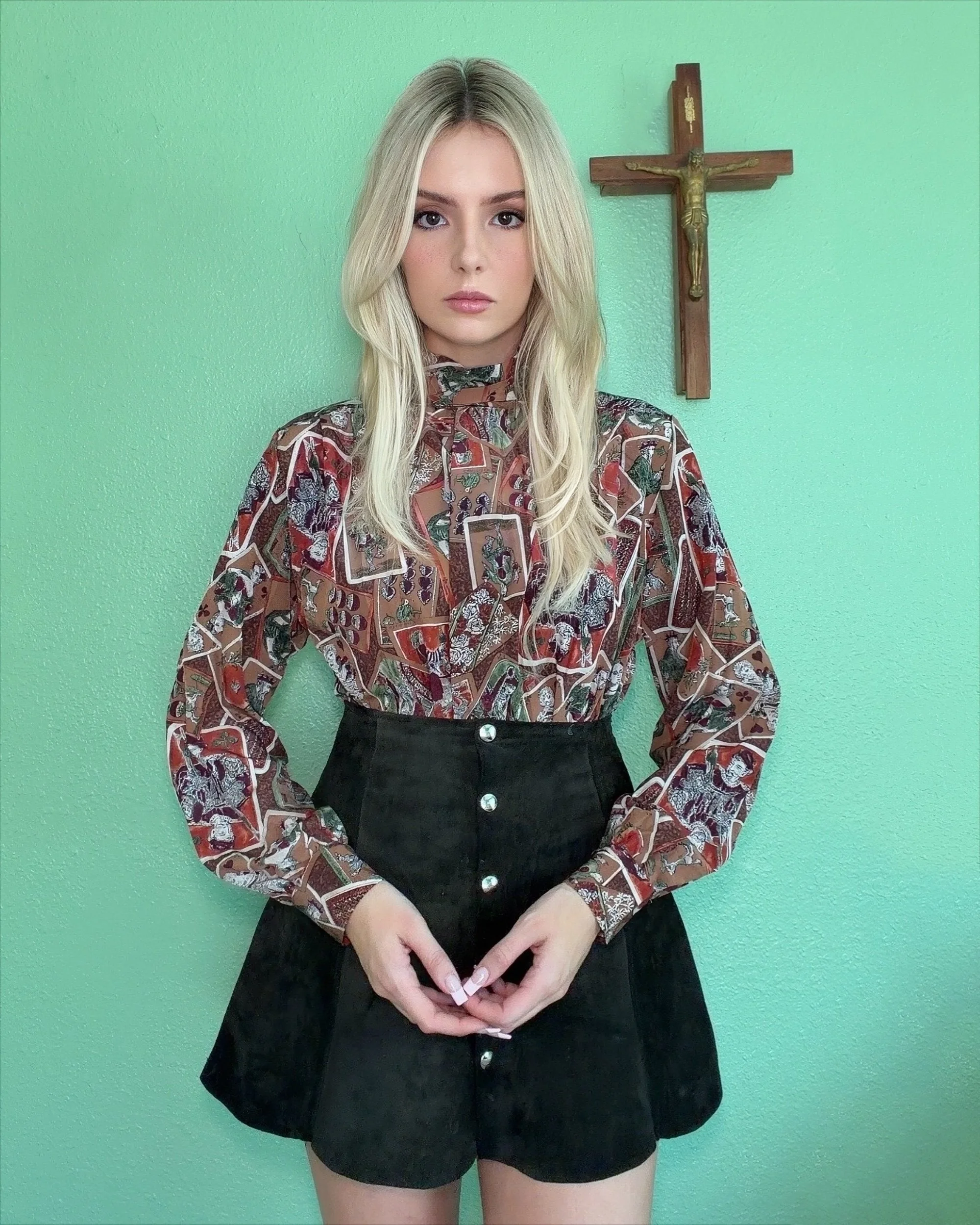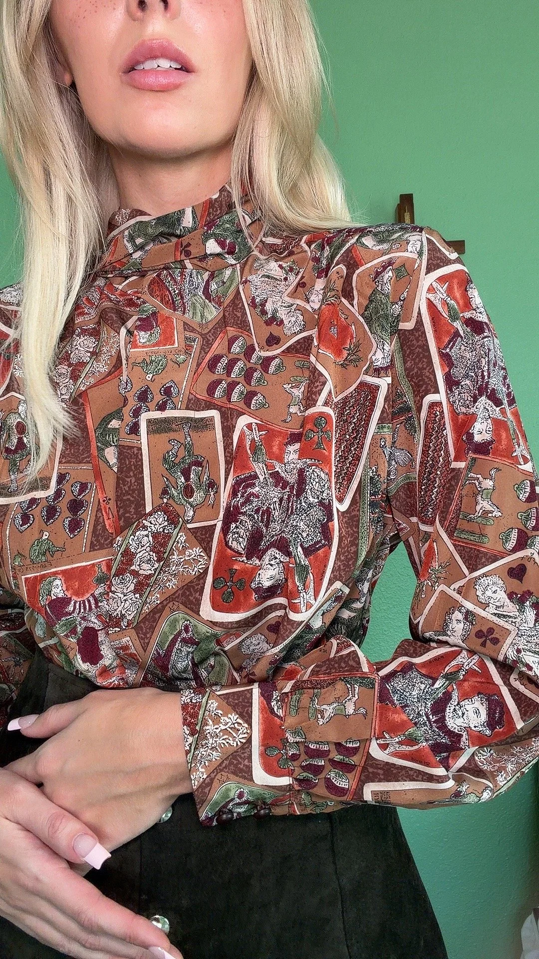 Vtg 60’s novelty style top with a beautiful mystical card pattern throughout. Hidden buttons up the front, and beautiful draped mock neck with hidden button to fasten.