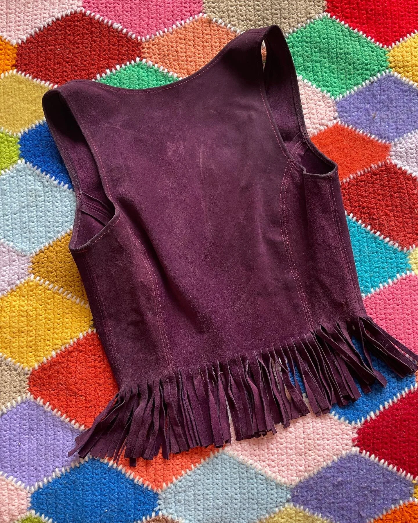 vtg 60’s purple suede lace up top with fringe adorning the hem. I love collecting any purple suede vintage items, and the matching butterfly patches have made this a very special part of my collection for sometime now, but after careful consideration I think it’s time for it to move on to a new owner