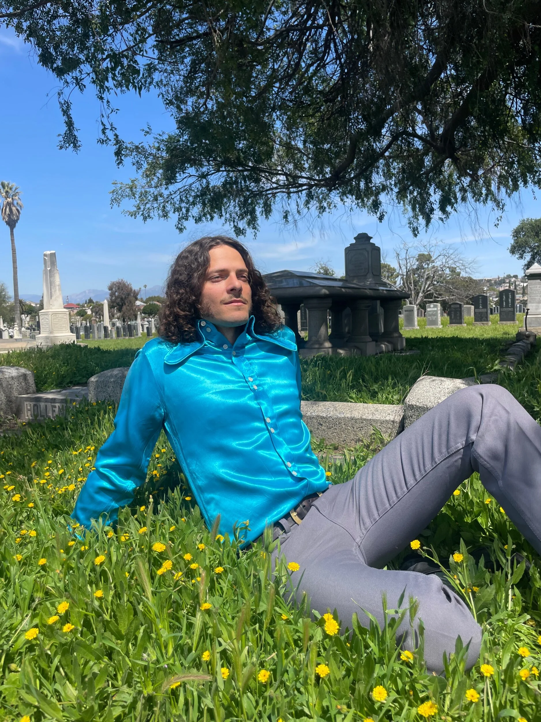 vtg 60’s liquid satin crystal blue button up with a dog eared collar. Absolutely magical and hard to find!