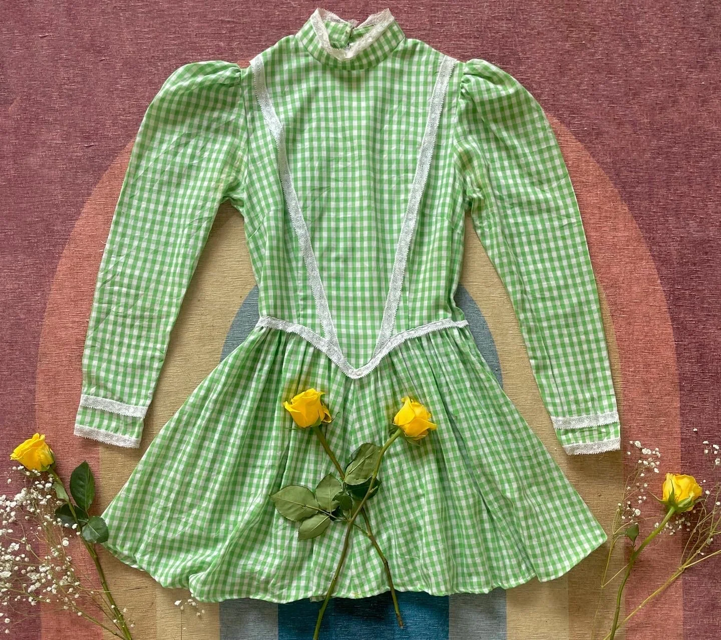 For Southern Belles and Sunday School dropouts, vtg 60’s green gingham muni dress with bishop sleeves and a high lace collar, white lace adorns the sleeves, neckline and bodice.