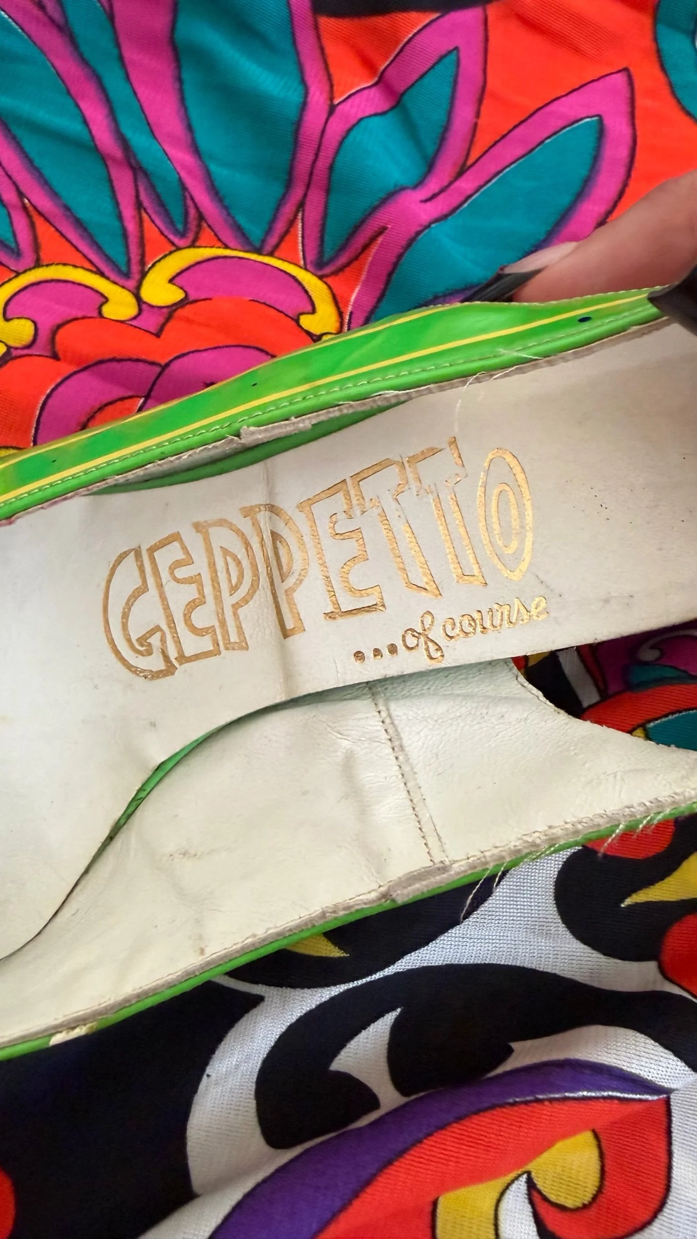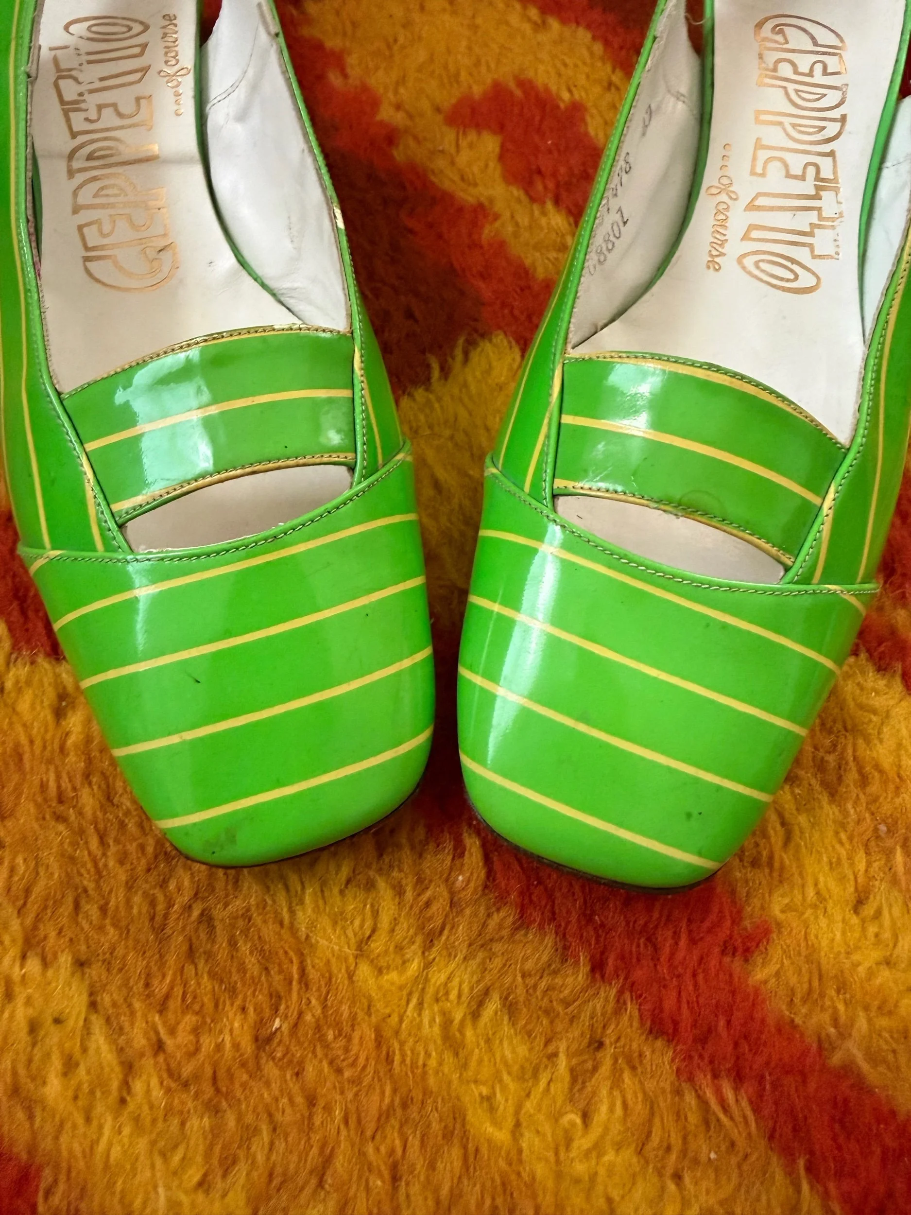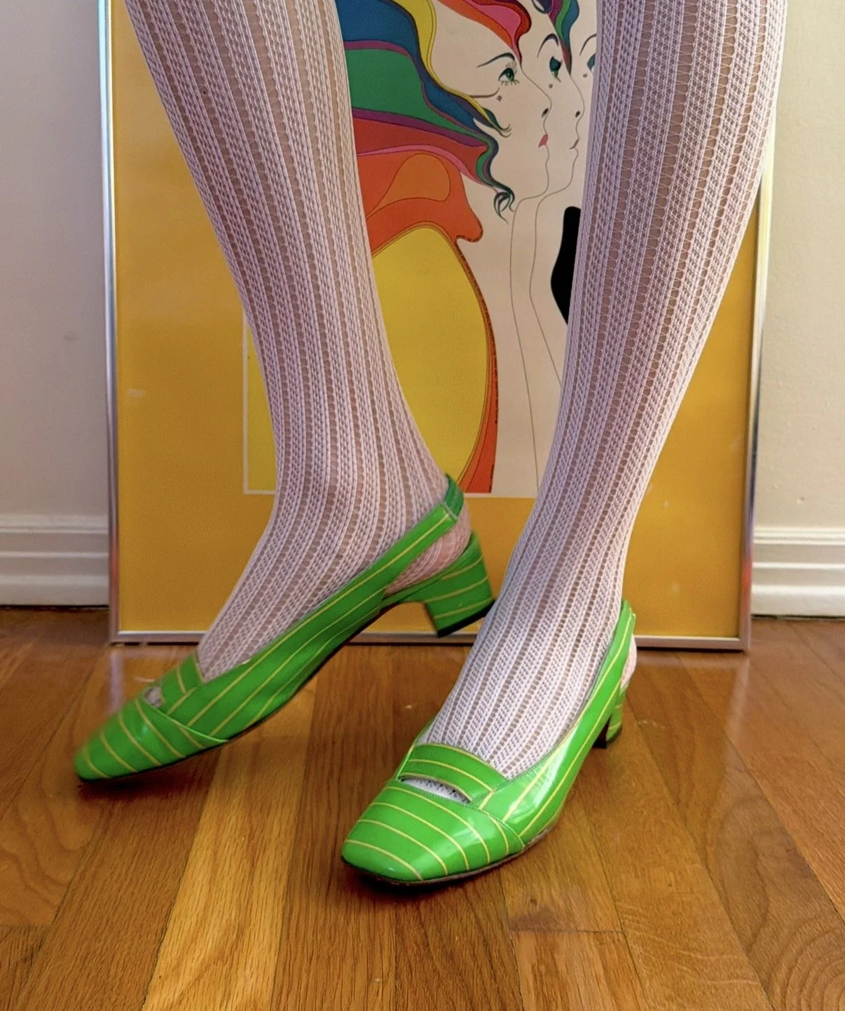 Vtg 60’s Candy drive mod sling back pumps in a beautiful green and yellow color way